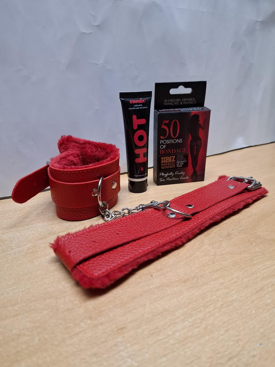 EL SET AL ROJO VIVO INCLUYE UN PAR DE ESPOSAS ROJAS CON HEBILLAS, UN JUEGO DE CARTAS 50 POSICIONES Y UN LUBRICANTE HIBRIDO HOT DE 30 ML
